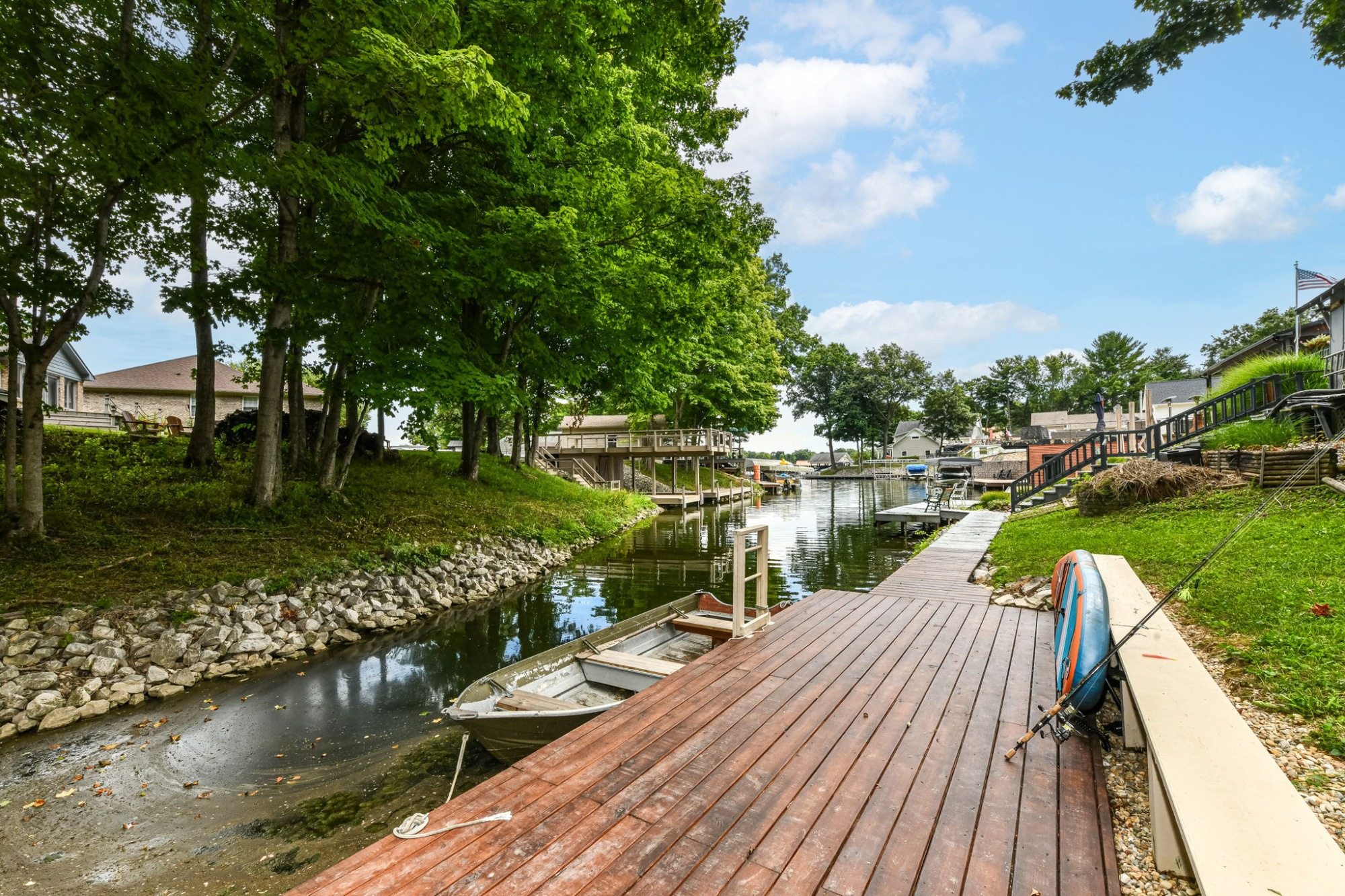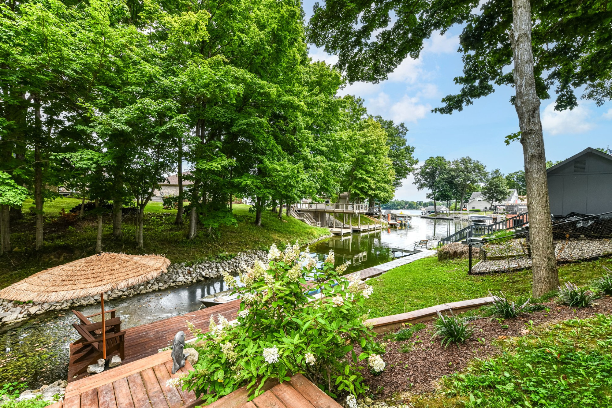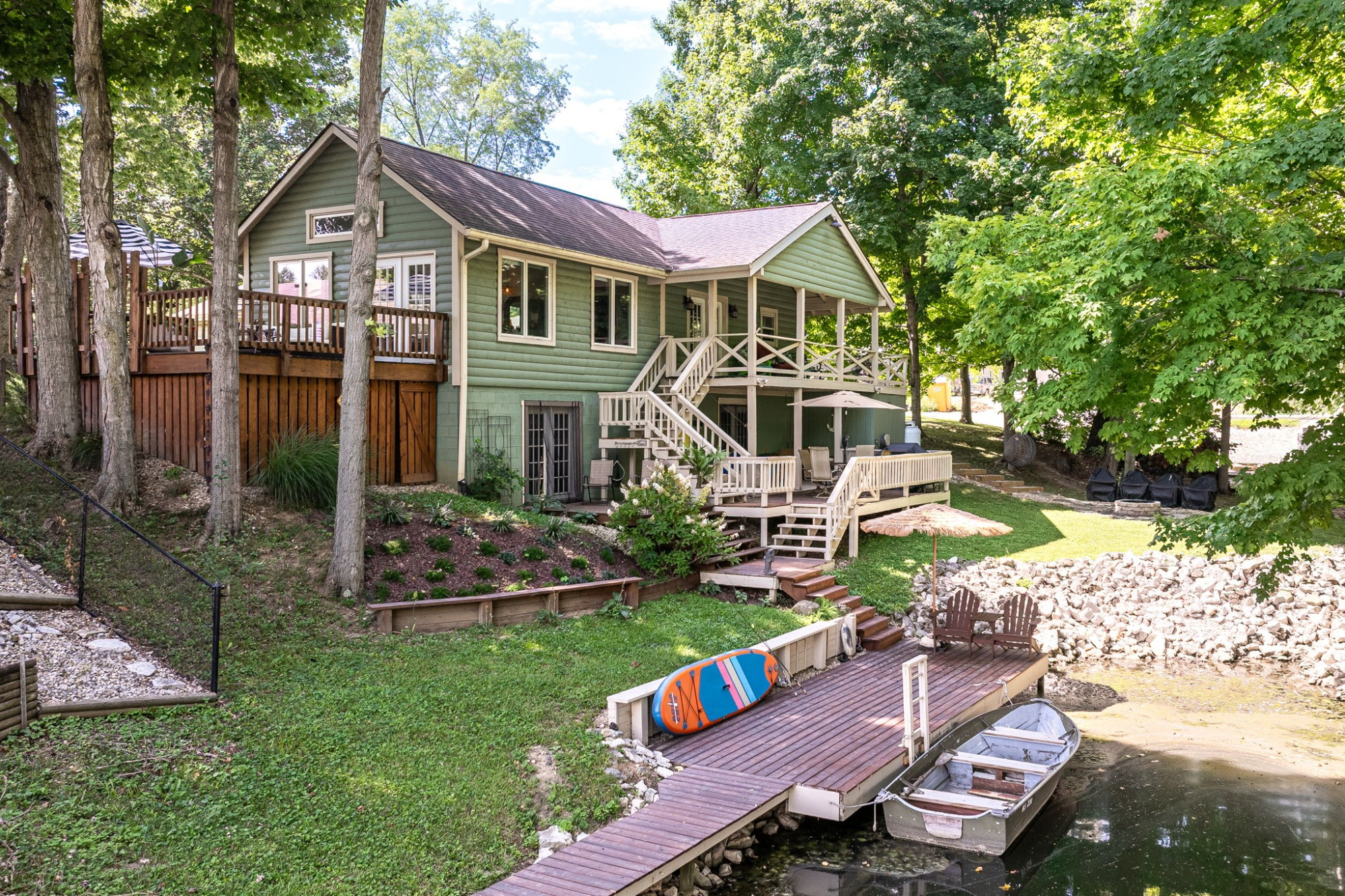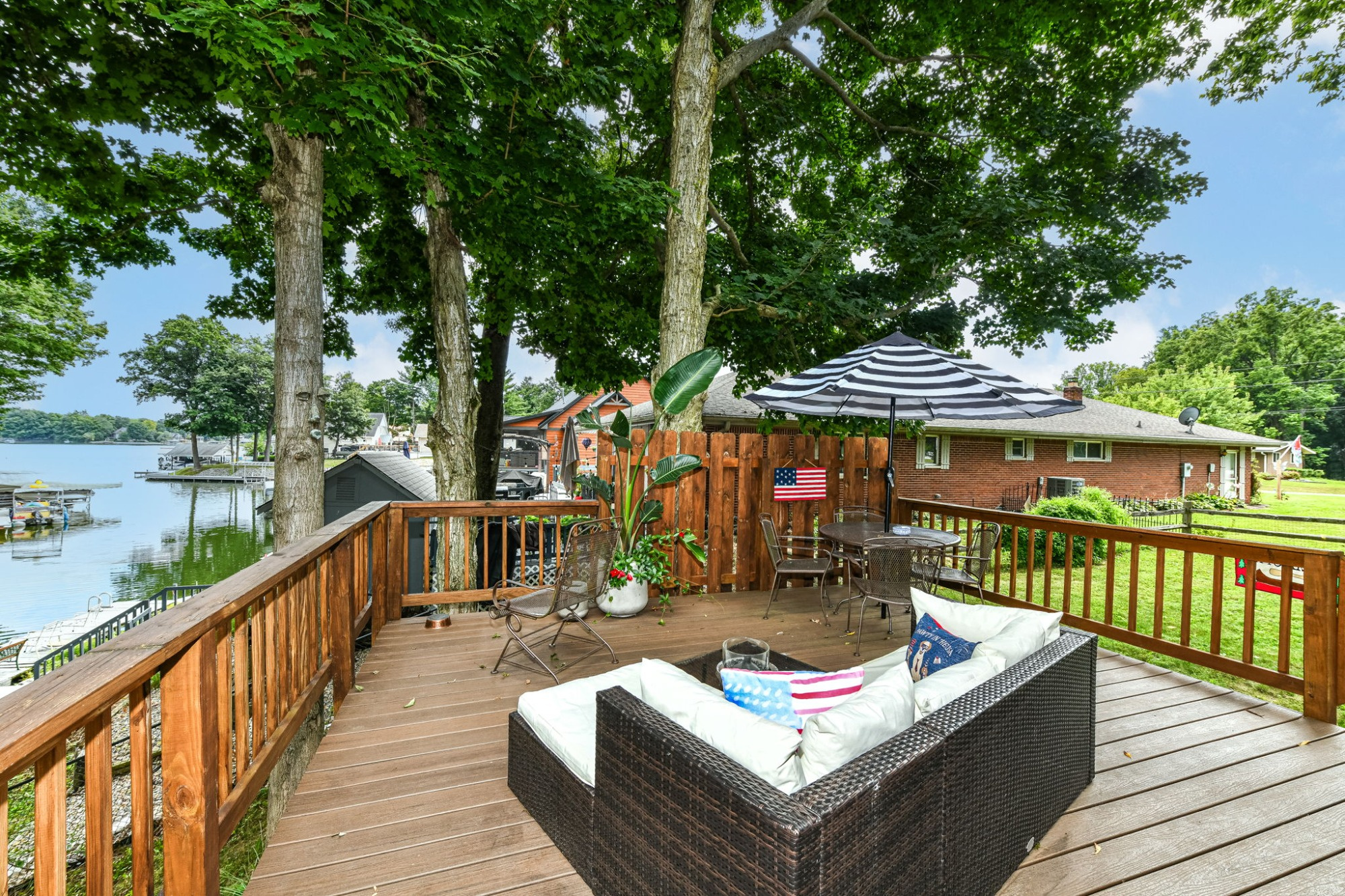 Perfectly nestled in a peaceful cove while still offering picturesque views of the main body of the lake. Sitting on a double lot, this property provides endless opportunities-expand the home, build a garage, or simply enjoy the extra space. This home is made for outdoor living, with multiple entertaining areas ideal for summer cookouts, lazy afternoons in the sun, or swimming and fishing right from your own dock. Inside, the spacious kitchen is a blank canvas-ready for you to design the culinary space of your dreams. There's plenty of room to add a large island with seating for 8 or more, making it the perfect gathering spot. The great room offers sweeping water views through large windows and direct access to one of the upper decks. Downstairs, the walkout basement features a roomy bunk area for guests, a wet bar, and even more space for entertaining-perfect for game nights or relaxing after a day on the lake. Your lake getaway awaits-bring your vision and make it your own!